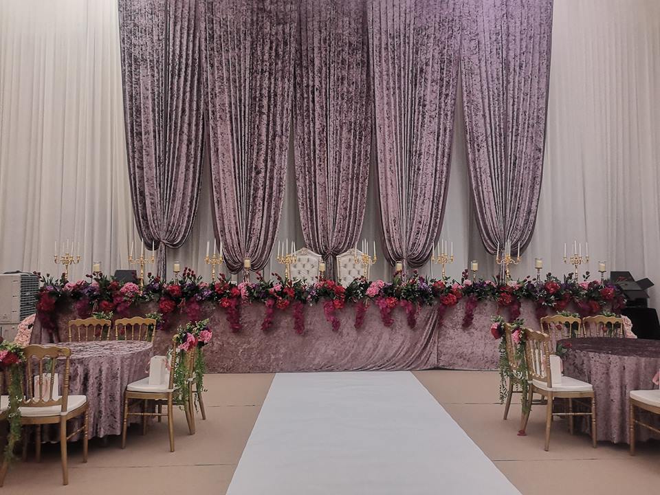 "For both solemnization and reception set up and decorations, credit to all team involved. Idea and decoration by Firmah Weddings, Muhamad Firdaus Rubae. Flowers, table and chair decorations by Rezqy Amani. Full cover draping by Zainol Fahmi Ahmad," tulisnya di Facebook.