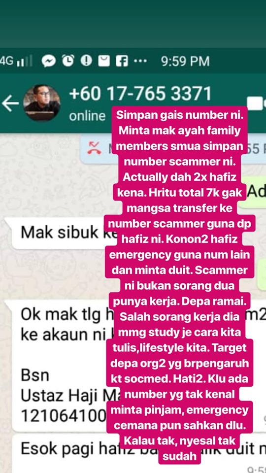 'Mak, tolong Hafiz transfer RM2,300 ke akaun ni' - Cubaan scam gagal, scammer kena game